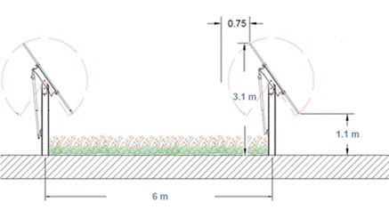 - Pour les ilots n°2 et 3, l’inter-rang sera de 3,5 m, la distance de pieux à pieux de 6 m et les hauteurs respectives point bas et point haut des panneaux à inclinaison maximale de 1,1 m et de 3,1 m ;