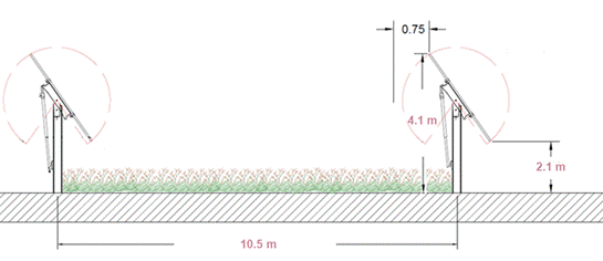 - Pour l’ilot n°1, l’inter-rang sera de 8 m, la distance de pieux à pieux de 10,5 m et les hauteurs respectives point bas et point haut des panneaux à inclinaison maximale de 2,1 m et de 4,1 m ;